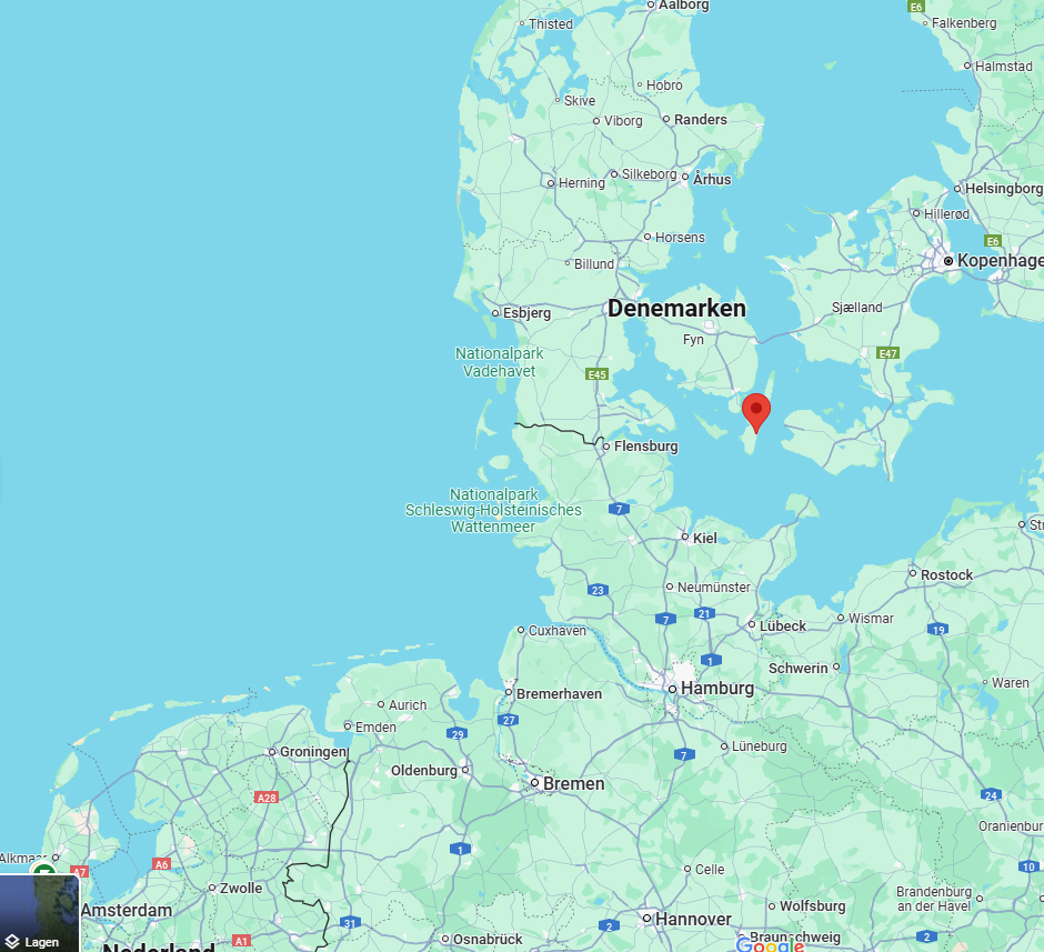 Nu is het aardige dat deze haplogroep overeenkomt met dat van een Viking die in de 10e eeuw is begraven op het eiland Kaagården, Langeland, Denemarken en wel in onderzoekslocatie grafnummer VK287. Dit eiland ligt in de Oostzee tegenover Kiel en Lübeck dus dicht bij Noord Duitsland. Zie de kaart hieronder.